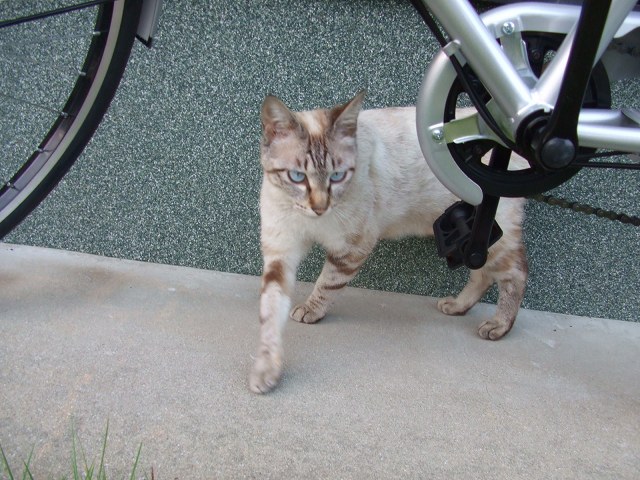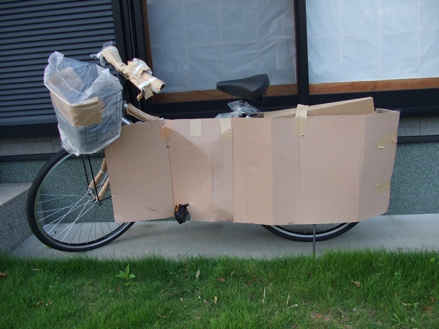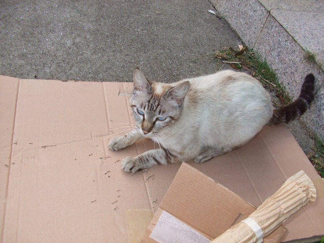 その自転車に張り巡らされたダンボールを必死にはがしていると猫が登場。